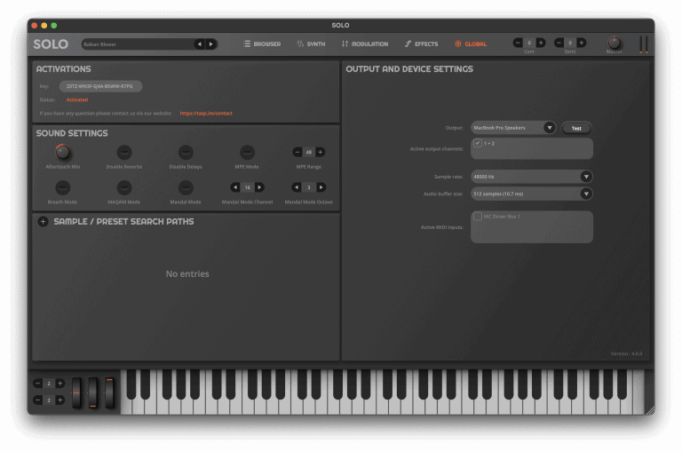 The standalone version of SOLO lets you play the virtual instrument independently, without requiring a DAW. Before getting started, ensure you have a connected MIDI controller and an audio interface capable of low-latency performance.